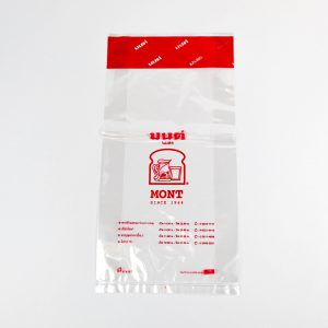 ถุงขนมปัง ถุงเบเกอรี่ มนต์นมสด สำหรับใส่ผลิตภัณฑ์ขนมปัง ลูกค้าต้องการความใส และเเข็งเป็นทรงในระดับหนึ่ง จึงเลือกให้เนื้อถุง PP นอกจากนี้ยังมีการพับข้าง เพื่อเพิ่มพื้นที่ในการใส่ขนมปัง ลายพิมพ์มีการระบุสาขา และเบอร์ติดต่อ รวมทั้งยังมีลูกเล่นด้านบนถุง ที่เว้น “มนต์” ตรงสีแดง