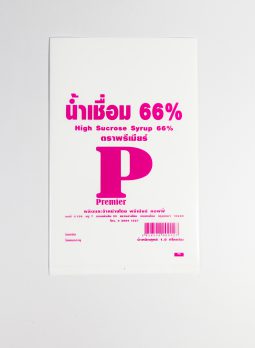 ถุงใส่อาหาร ใส่น้ำเชื่อม ตราพรีเมียร์ ลูกค้าต้องการถุงที่มีความหนา มีความยืดหยุ่นพอสมควร และซีลติดได้ง่าย เนื่องจากใช้บรรจุน้ำเชื่อมที่ต้องไม่มีการรั่วซึม จึงให้เป็นถุงเนื้อ PE ที่ตอบคุณสมบัติดังกล่าว ในการพิมพ์เน้นในชื่อผลิตภัณฑ์และยี่ห้อ รวมทั้งยังมีบาร์โค้ดในการทำสต็อกสินค้า
