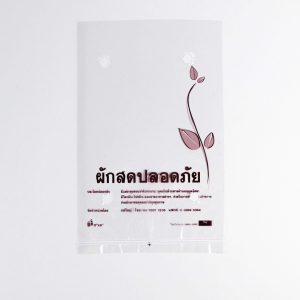 ถุงใส่ผัก ผักสดปลอดภัย ลูกค้าเน้นที่ความใส เพื่อให้เห็นถุงตัวผักเป็นสำคัญ จึงเลือกใช้ถุงพลาสติกเนื้อ PP ในการผลิต ในส่วนของลายพิมพ์นั้นมีการเล่นความหนาบางของสี ในส่วนรูปใบไม้ทำให้ภาพดูมีมิติ อีกทั้งยังมีการระบุประโยชน์ของผัก และติดต่อสำหรับสั่งซื้ออีกด้วย