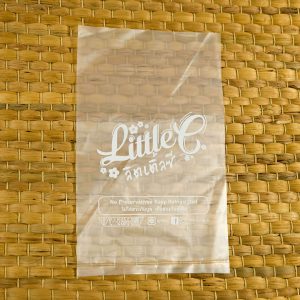 ถุงขนมปังไส้ครีมนมสดฮอกไกโด Little C ลูกค้านำถุงไปใส่ขนมปังเป็นชิ้น ซึ่งไม่ต้องรับน้ำหนักมาก ทำให้สามารถทำขนาดบางได้ ตัวถุงเนื้อ HD ซึ่งจะเป็นสีขุ่นตามลักษณะของ HD นอกจากพิมพ์โลโก้ แล้วยังมีระบุ ช่องทางการติดต่อ และเลข อ.ย. เพื่อเพิ่มความมั่นใจให้ผู้บริโภค