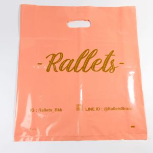 ถุงแฟชั่นสำหรับใส่เสื้อผ้าจาก Instagram แบรนด์ Rallets_bkk ใช้เนื้อถุง PE เพื่อให้ได้สัมผัสที่เรียบเนียน และมีการพิมพ์ช่องทางการติดต่อทั้ง Instagram และ Line Official Account เพื่อเพิ่มโอกาสทางการตลาด